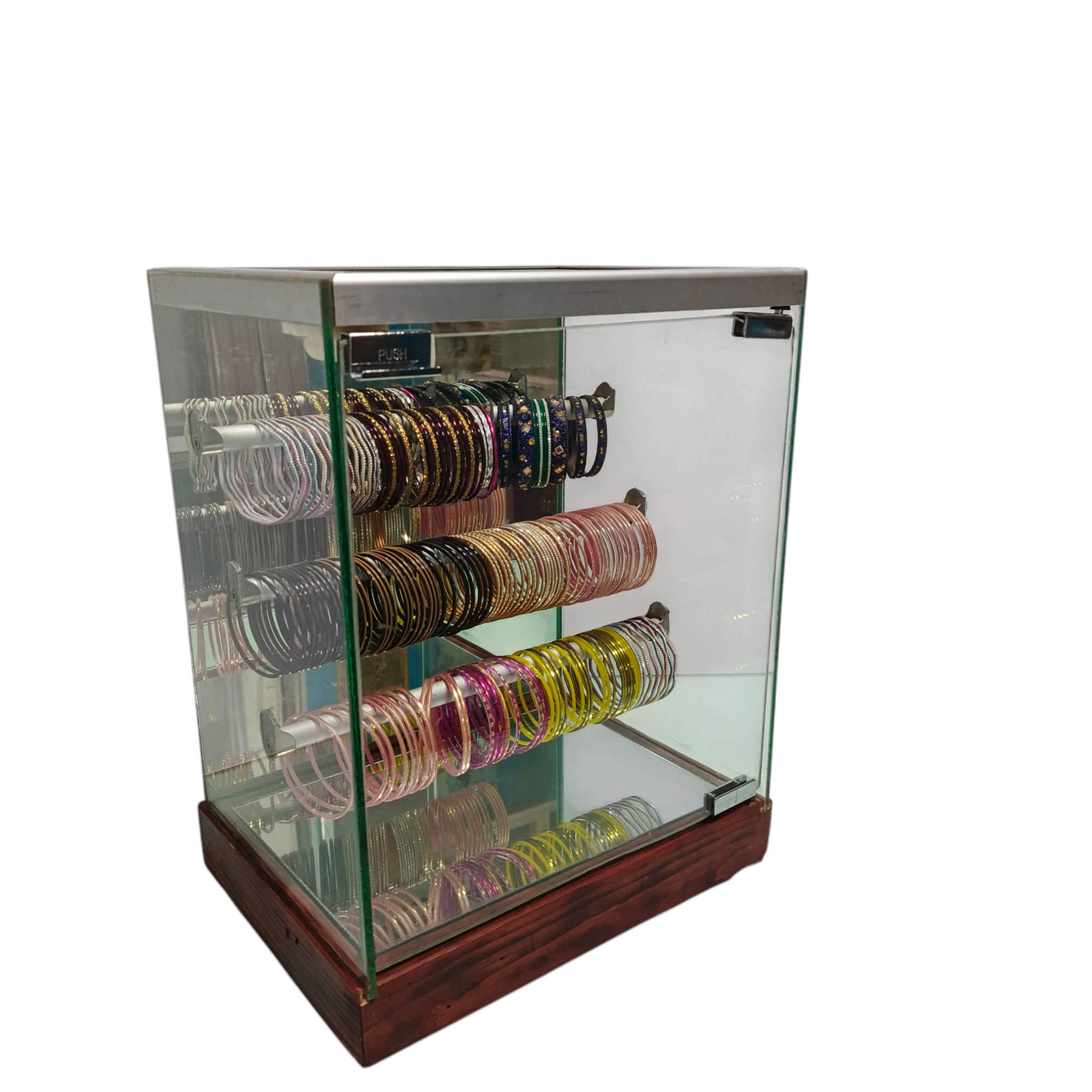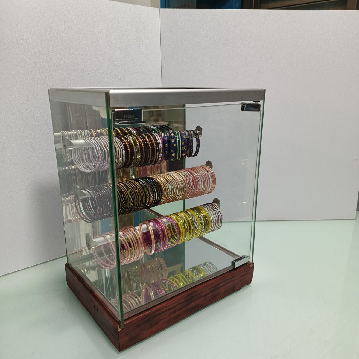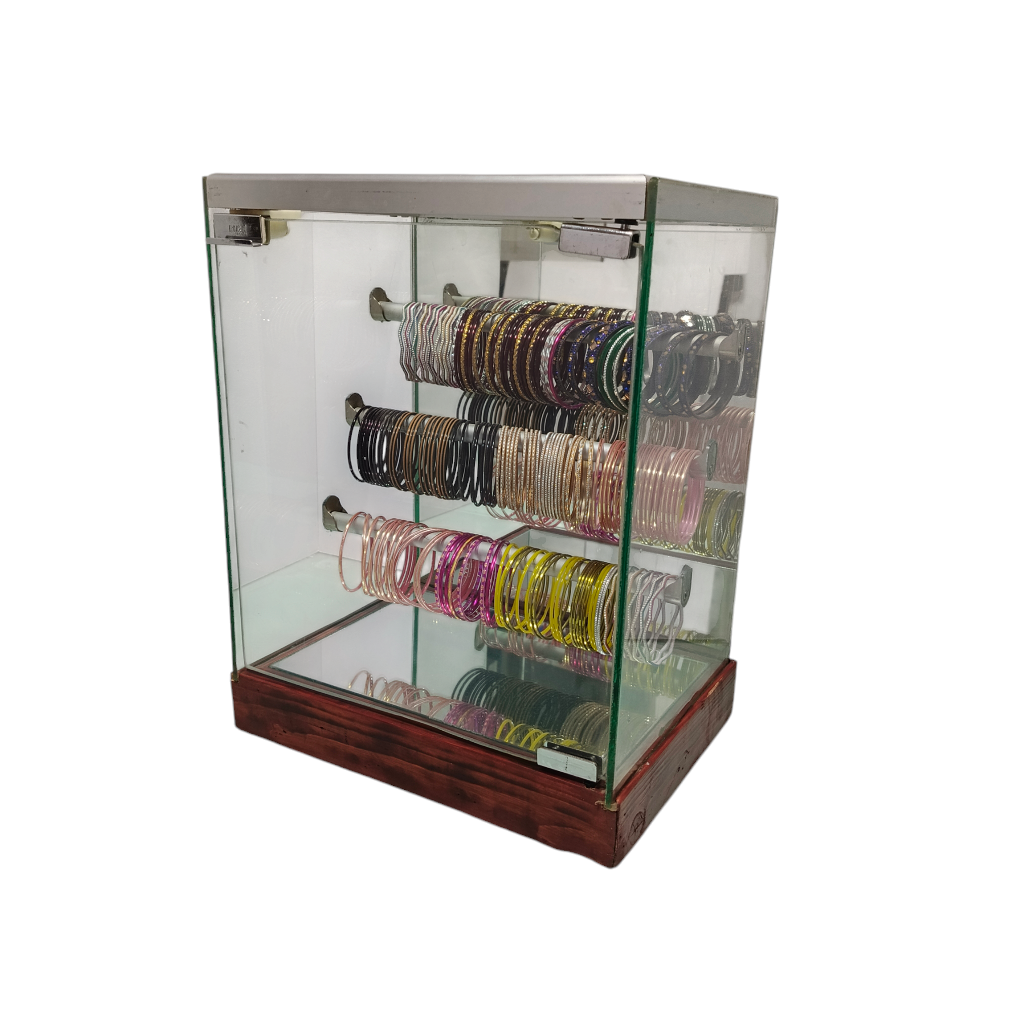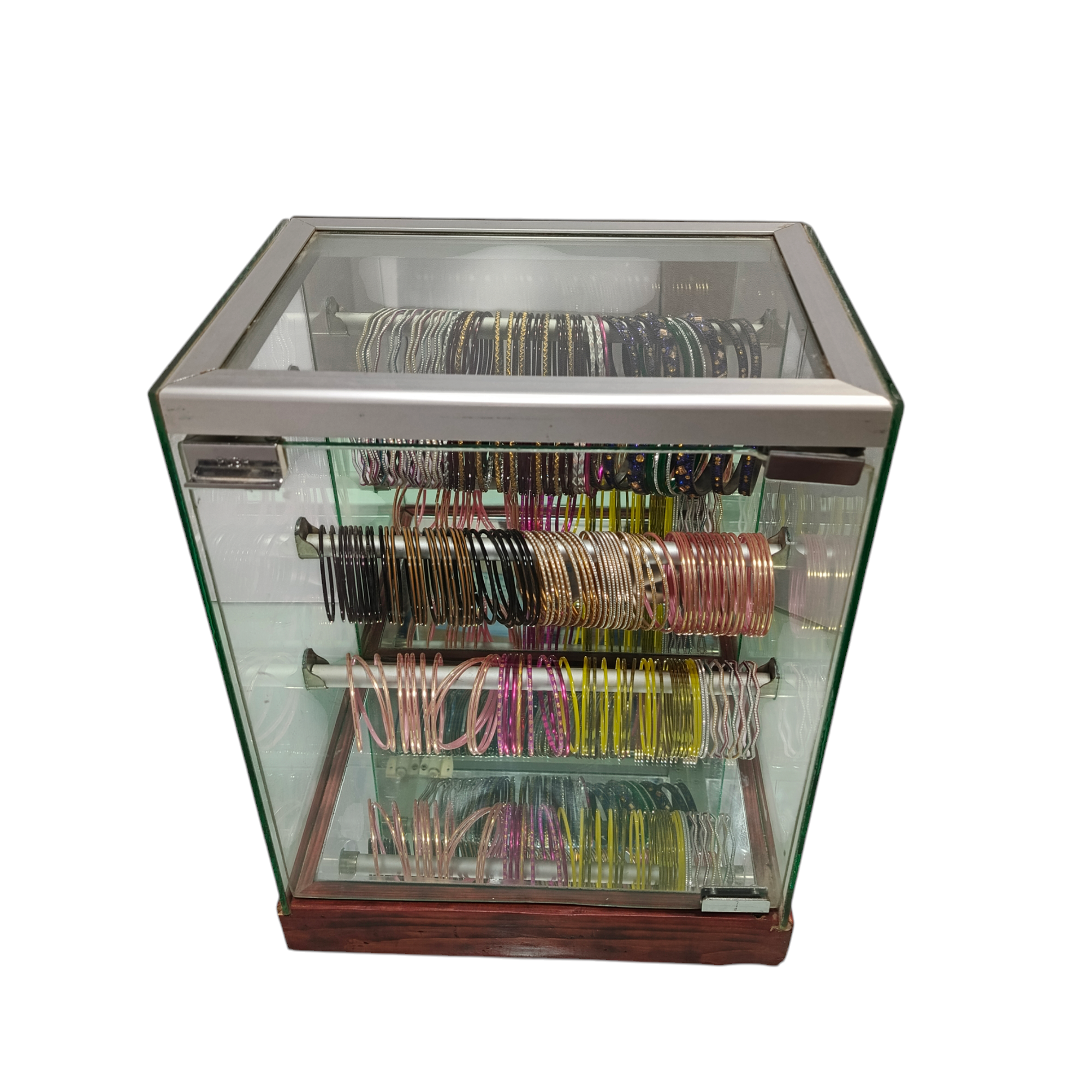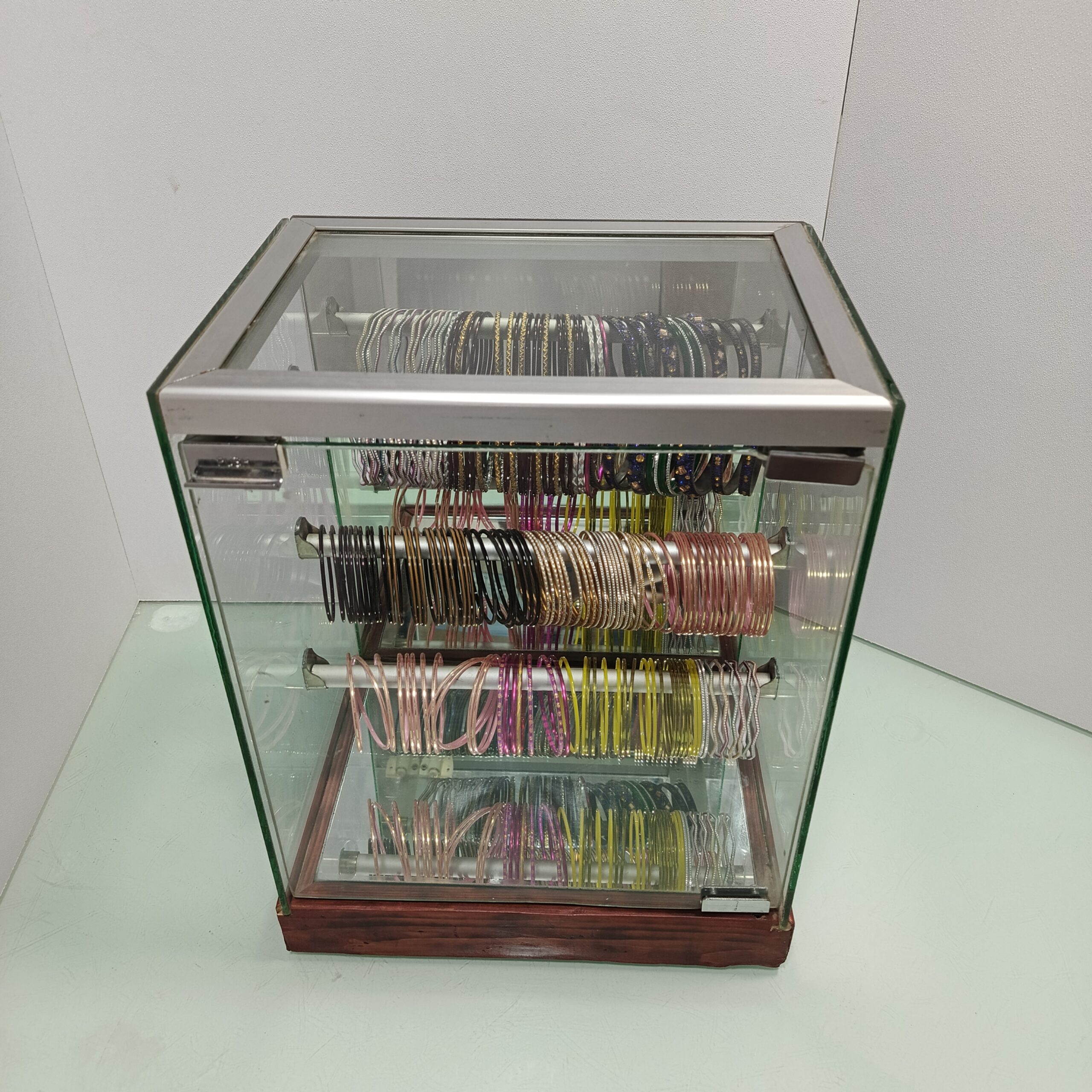 A glass bangle box with an aluminum and wood frame is a stylish and durable storage or display solution designed to protect and showcase delicate glass bangles. Here are some key aspects of its design and functionality:
